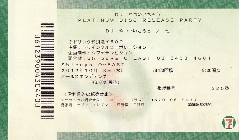 DJ やついいちろう「PLATINUM DISC RELEASE PARTY」チケット半券