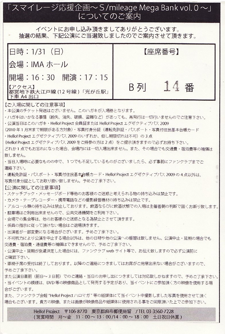 スマイレージ応援企画「S/mileage Mega Bank vol.0」入場券ハガキ