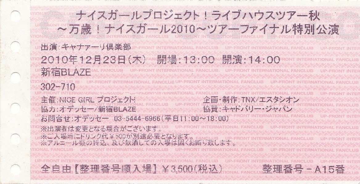 キャナァーリ倶楽部ライブ「万歳!ナイスガール2010」チケット半券