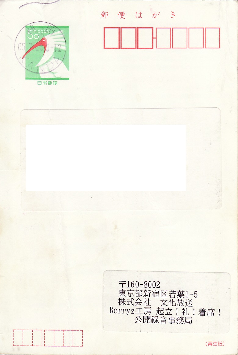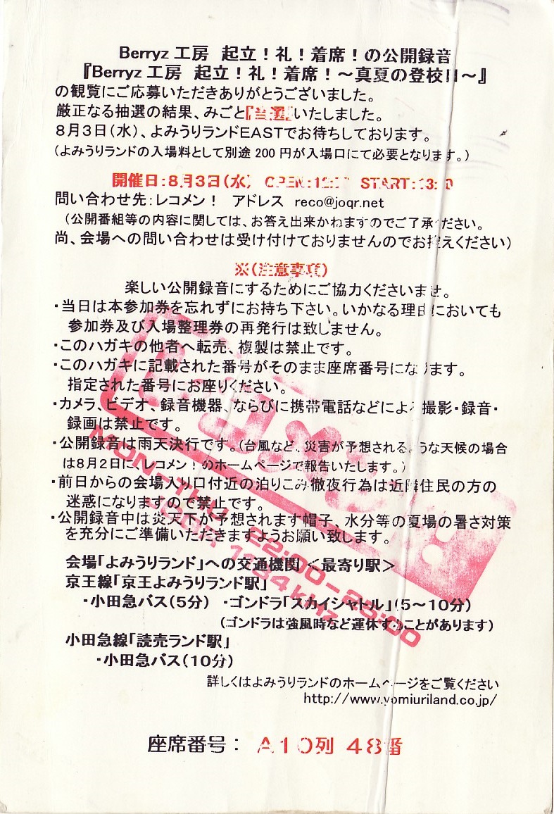 Berryz工房「起立!礼!着席!の公開録音」当選はがき