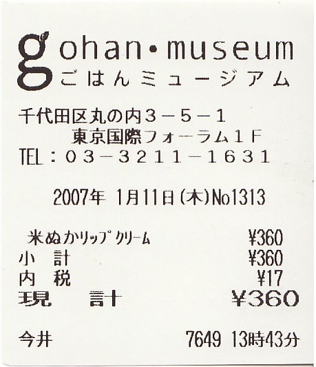 ごはんミュージアム「米ぬかリップクリーム」販売店レシート