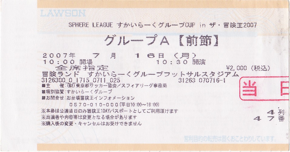 スフィアリーグ「ザ・冒険王2007」グループA【前節】チケット半券