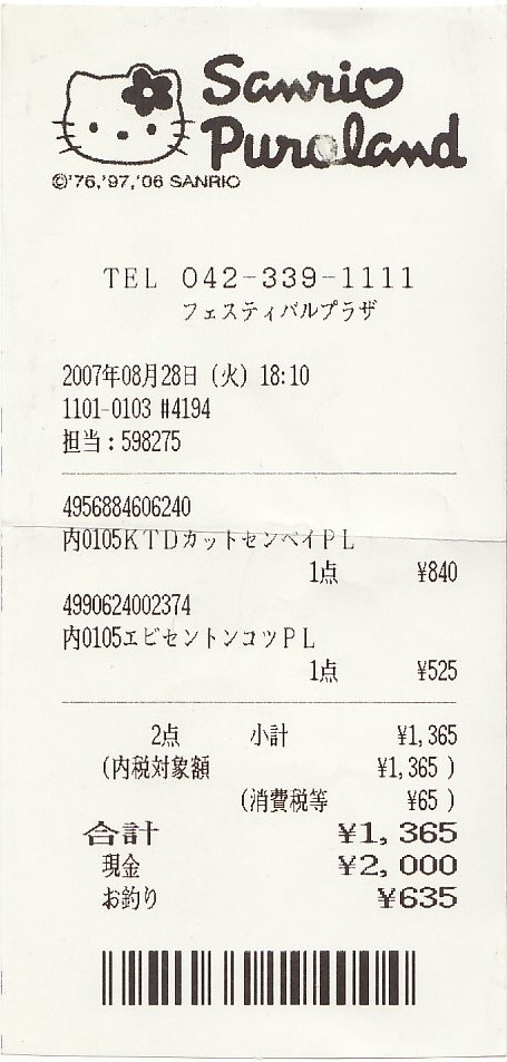 サンリオピューロランド「フェスティバルプラザ」レシート