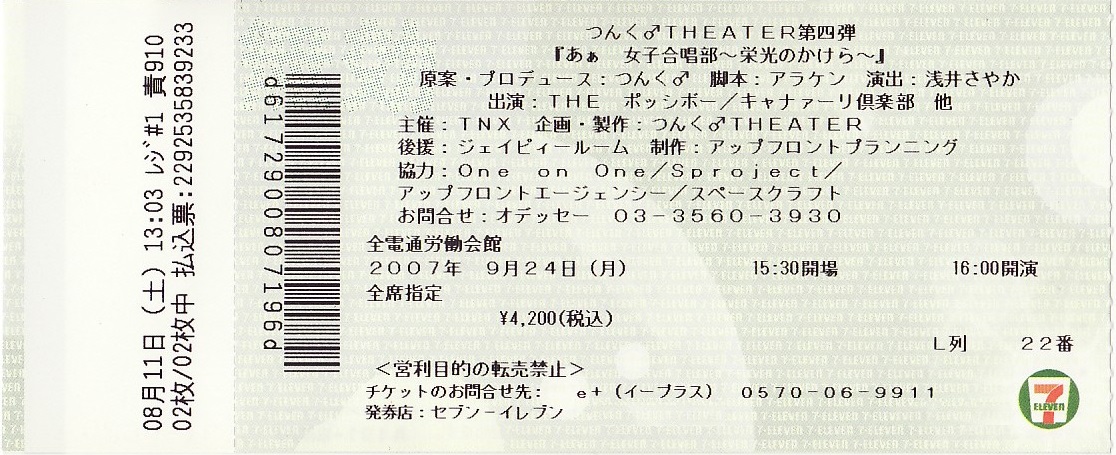 つんく♂THEATER 第四弾『あぁ 女子合唱部 ~栄光のかけら~』チケット半券