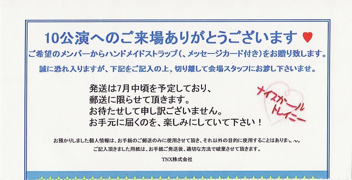 「ナイスガールトレイニー定期ライブ 10公演来場特典」申し込み用紙半券