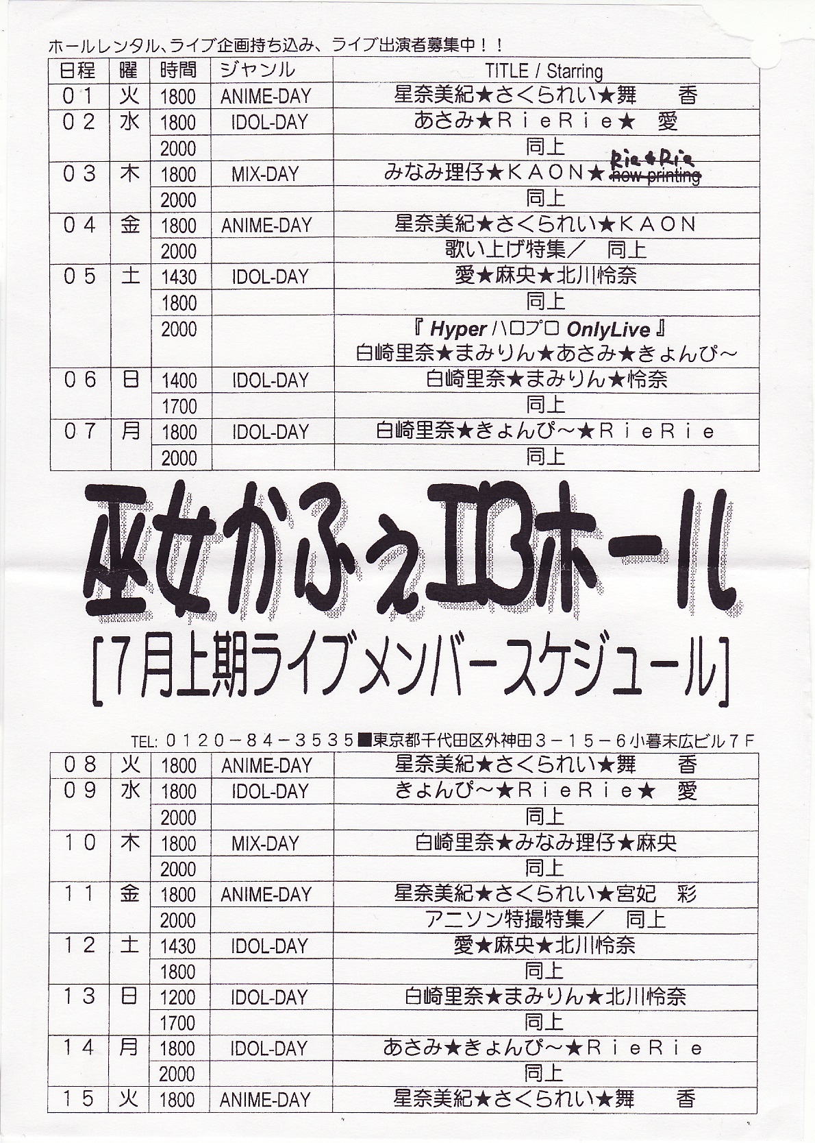 巫女カフェIBホール[2008年7月上期ライブメンバースケジュール]チラシ