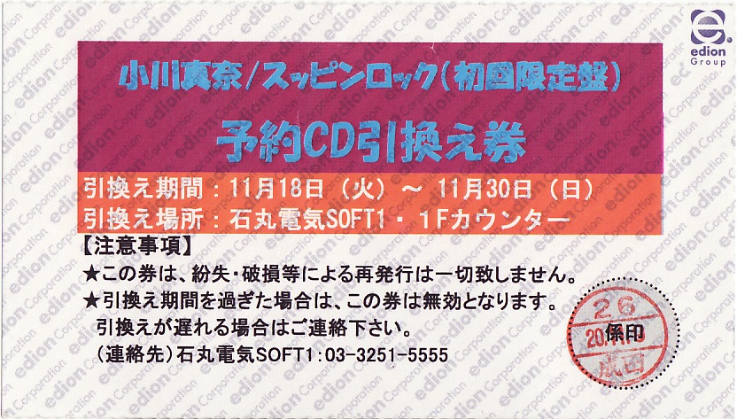 小川真奈「スッピンロック」予約CD引換券 ※引換え忘れ