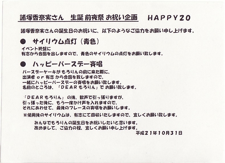 有志配布「諸塚香奈美さん 生誕前夜祭お祝い企画」チラシ