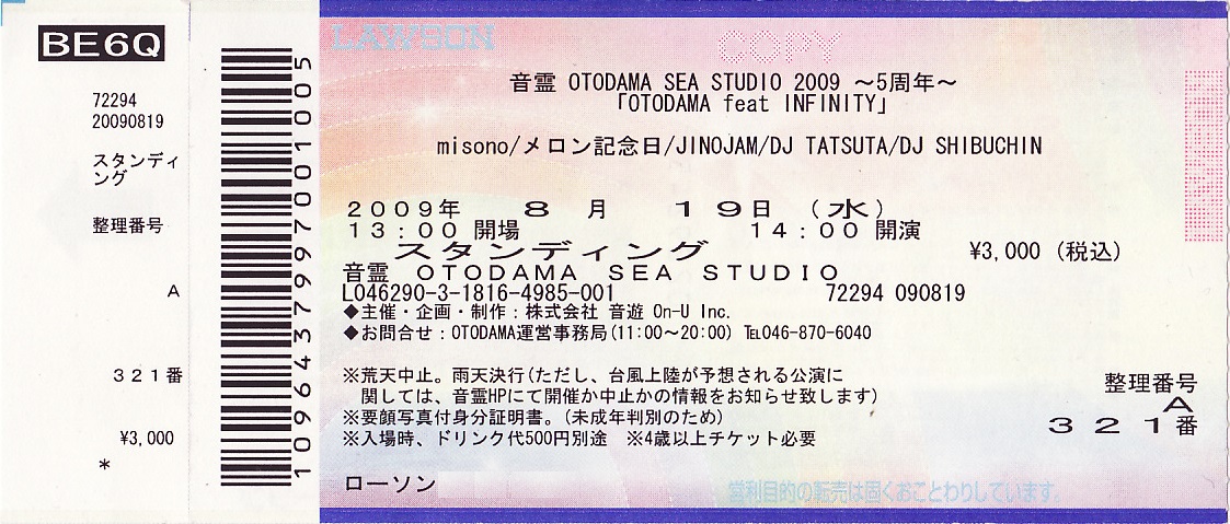 音霊 OTODAMA SEA STUDIO 2009 ~5周年~「OTODAMA feat INFINITY」チケット半券