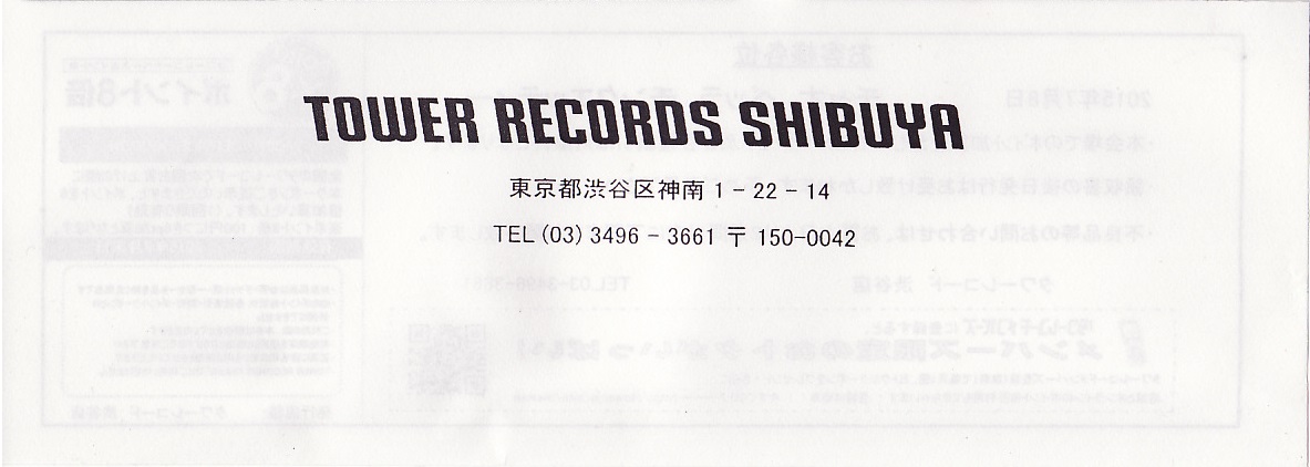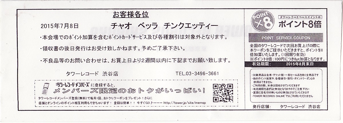 チャオ ベッラ チンクエッティ『表参道/二子玉川/Never Never Give Up』タワレコ渋谷店領収書