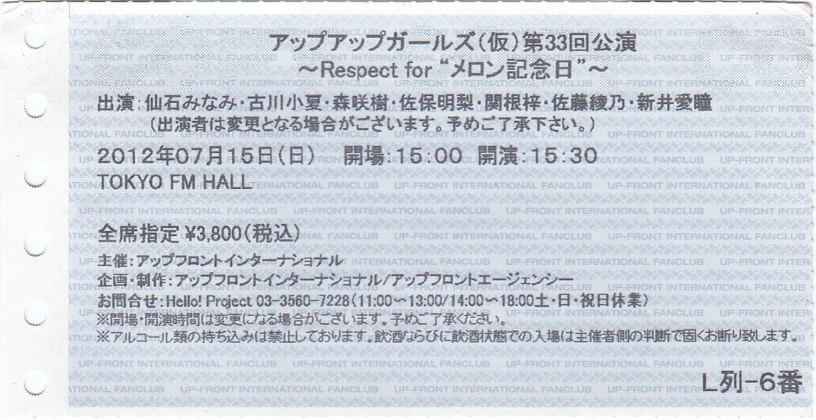 アップアップガールズ(仮)第33回公演「Respect for メロン記念日」@TOKYO FM HALL チケット半券