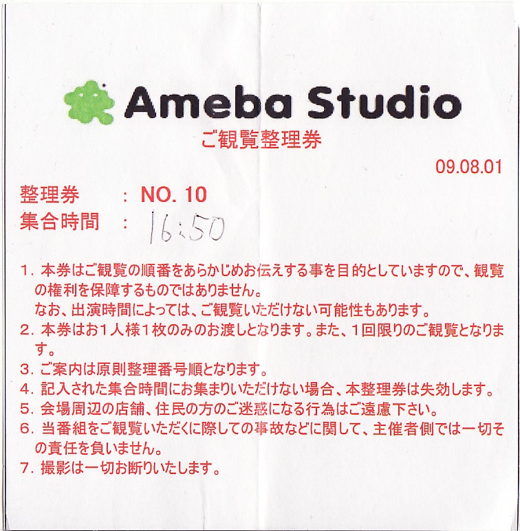 2009.08.01「Ameba Studio Show」観覧整理券