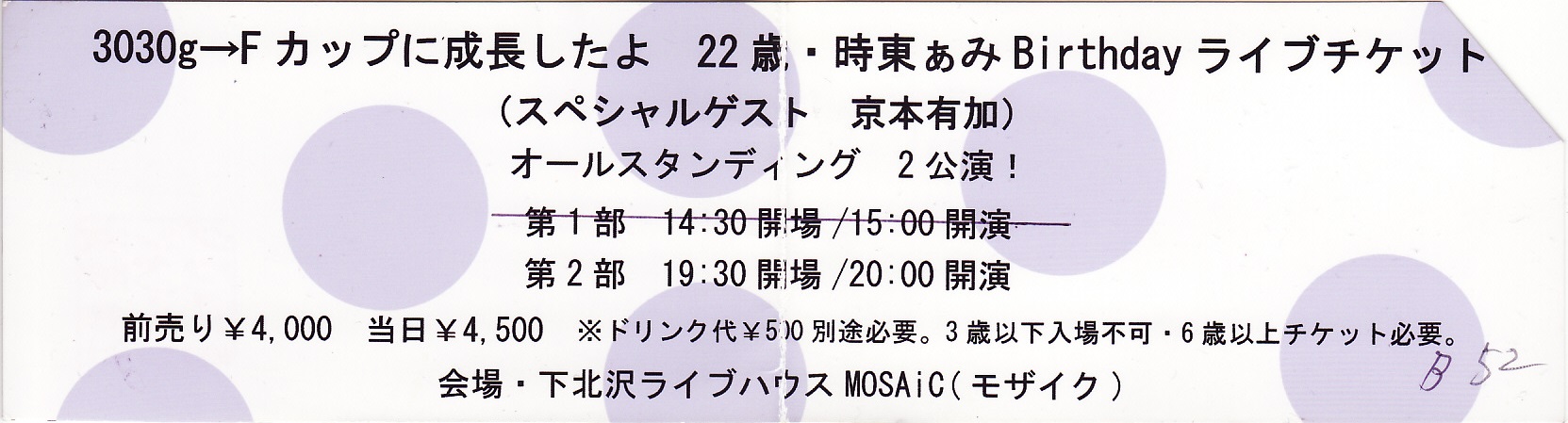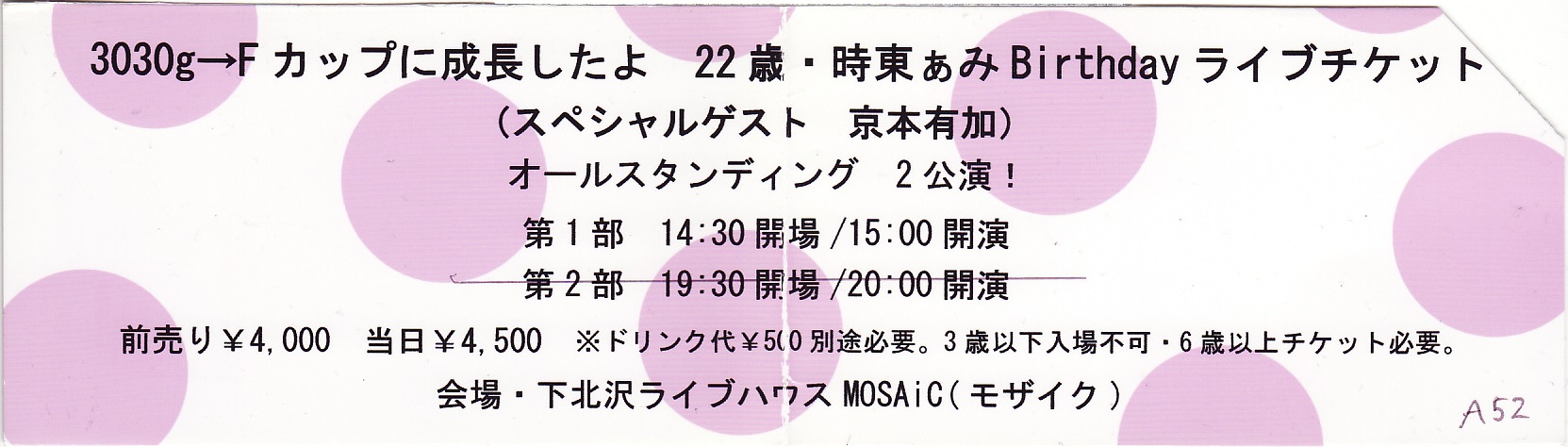 「3030g→Fカップに成長したよ♥ 22歳・時東ぁみ Birthdayライヴ」チケット半券